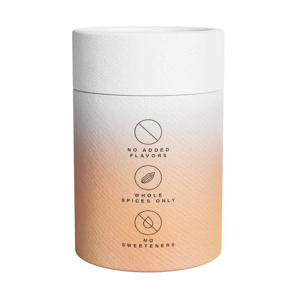 Cardamom, ginger, cinnamon, clove, and black pepper are layered to support the tea, not overwhelm it.